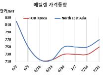 에틸렌(Ethylene)은 상승했다. 에틸렌 시세는 7월21일 CFR NE Asia가 톤당 770달러로 20달러 상승했으나 CFR SE Asia는 745달러로 변동이 없었다. FOB Korea는 750달러로 20달러 올랐다. 표, 그래프: <에틸렌 가격동향> <화학저널 2023/07/25> |