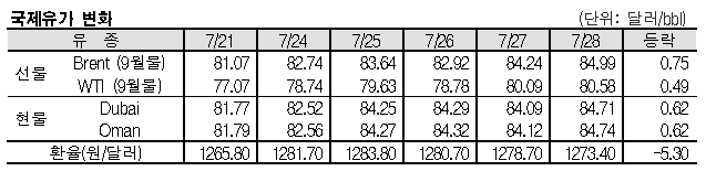 7월28일 국제유가는 미국 인플레이션 둔화 영향으로 상승했다. 국제유가는 미국 인플레이션 둔화로 금리 동결 가능성 및 미국 경제 연착륙 기대감이 고조됨에 따라 상승했다. 표, 그래프: <국제유가 변화> <화학저널 2023/07/31> |