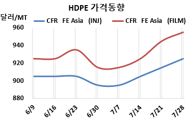 HDPE(High-Density Polyethylene)는 또다시 상승했다. HDPE 시세는 7월26일 인젝션(Injection) 그레이드 기준 CFR FE Asia가 톤당 925달러로 10달러 상승했으나 CFR SE Asia는 950달러로 변동이 없었다. 블로우몰딩(Blow-Molding)도 FEA는 930달러로 10달러 올랐으나 SEA는 955달러로 보합세를 형성했다. 필름(Film)은 FEA가 955달러, SEA는 975달러로 각각 10달러 상승했고, 얀(Yarn)은 FEA가 945달러, SEA는 975달러로 각각 10달러 올랐다. CFR S Asia는 인젝션이 1015달러, 블로우몰딩 1030달러, 필름 1025달러로 각각 20달러 올랐고, 얀은 1025달러로 15달러 상승했다. 표, 그래프: <HDPE 가격동향> <화학저널 2023/07/31> |