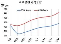 프로필렌 시세는 7월28일 FOB Korea가 톤당 745달러로 10달러, CFR SE Asia는 775달러로 20달러 상승했다. CFR China, CFR Taiwan은 795달러로 15달러 올랐다.