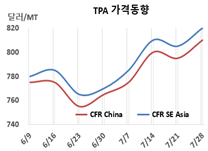 PTA(Purified Terephthalic Acid)는 상승했다. PTA 시세는 7월28일 CFR China가 톤당 810달러로 15달러, CFR SE Asia도 820달러로 15달러 상승했다. CFR India도 870달러로 15달러 올랐다. 표, 그래프: <TPA 가격동향> <화학저널 2023/08/03> |