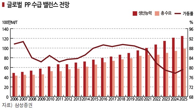 PP를 중심으로 일부 석유화학제품은 글로벌 공급이 수요를 웃돌면서 수익성이 최근 10년 평균치를 밑도는 수준으로 악화되고 있다.