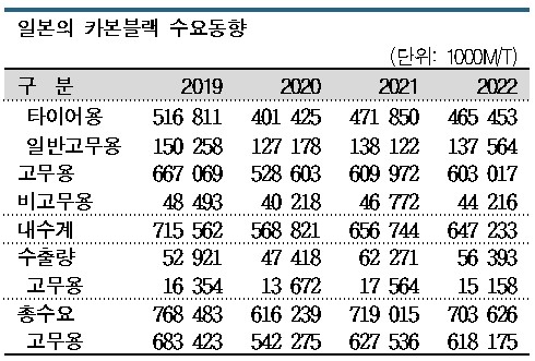 일본 카본블랙협회에 따르면, 2022년에는 수입을 포함 카본블랙 수요가 70만3626톤으로 2.1% 감소했다. 타이어용이 1.4%, 일반고무용은 0.4% 감소함으로써 고무용이 총 60만3017톤으로 1.1% 줄었고 비고무용도 5.5% 감소해 내수 전체가 64만7233톤으로 1.4% 줄어든 것으로 나타났다.