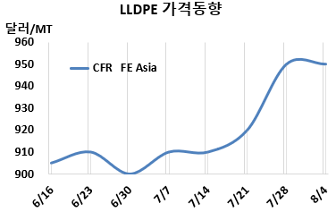 LLDPE(Linear Low-Density Polyethylene)는 주춤했다. LLDPE 시세는 8월2일 CFR FE Asia가 톤당 950달러로 변동이 없었으나 CFR SE Asia는 970달러로 15달러 상승했다. CFR S Asia는 1000달러로 5달러 올랐다. 표, 그래프: <LLDPE 가격동향> <화학저널 2023/08/07> |