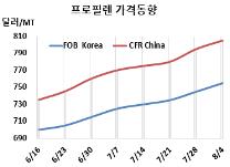 프로필렌(Propylene)은 상승을 계속했다. 프로필렌 시세는 8월4일 FOB Korea가 톤당 755달러, CFR SE Asia는 785달러로 각각 10달러 상승했다. CFR China, CFR Taiwan은 805달러로 10달러 올랐다. 표, 그래프: <프로필렌 가격동향> <화학저널 2023/08/08> |