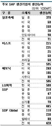 국내에서는 LG화학이 여수 50만톤 플랜트를 가동하며 최대 SAP 생산기업 지위를 확보하고 있다.