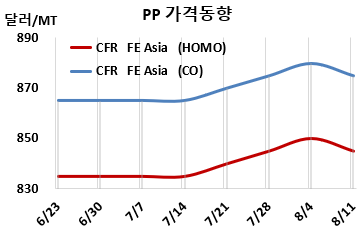 8월 중국에 공급하는 호모(Homo) 그레이드는 중동기업이 CFR 830-860달러로 5달러 낮추었고, 동남아 공급물량은 중동기업이 CFR 900-950달러를 요구했다. 인디아 공급물량은 중동기업이 CFR 970달러, 사우디가 CFR 1000달러를 제시했다. 인디아 릴라이언스(Reliance Industries)는 PP 공급가격을 kg당 2루피, ICP 및 RCP 그레이드는 kg당 2.25루피 인상했다.