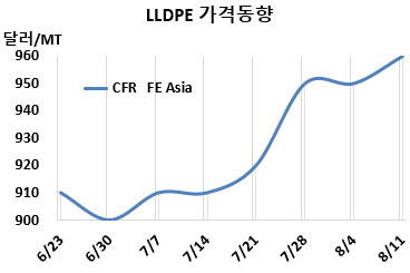 LLDPE 시세는 8월9일 CFR FE Asia가 톤당 960달러로 10달러, CFR SE Asia는 975달러로 5달러 상승했다. CFR S Asia도 1010달러로 10달러 올랐다.
