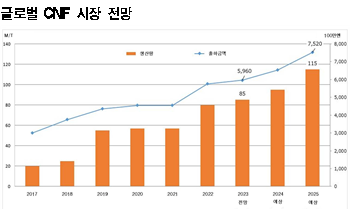 CNF(Cellulose Nano Fiber)는 시장 성장에도 불구하고 채용에서 난항을 겪고 있다. 표, 그래프: <글로벌 CNF 시장 전망> <화학저널 2023/08/17> |
