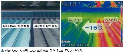 지붕용 차열페인트 Ales Cool은 여름 태양광을 높은 효율로 반사해 지붕 표면과 건물내부의 온도 상승을 막고 쾌적한 실내환경을 유지할 수 있게 한다.