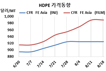 HDPE(High-Density Polyethylene)는 전반적으로 보합세를 형성했다. HDPE 시세는 8월16일 인젝션(Injection) 그레이드 기준 CFR FE Asia가 톤당 925달러로 변동이 없었으나 CFR SE Asia는 980달러로 10달러 상승했다. 블로우몰딩(Blow-Molding)도 FEA는 940달러로 보합세를 형성했으나 SEA는 985달러로 10달러 상승했다. 필름(Film)은 FEA가 990달러, SEA는 1015달러로 보합세를 형성했고, 얀(Yarn)은 FEA가 970달러, SEA는 1005달러로 변동이 없었다. 표, 그래프: <HDPE 가격동향> <화학저널 2023/08/21> |