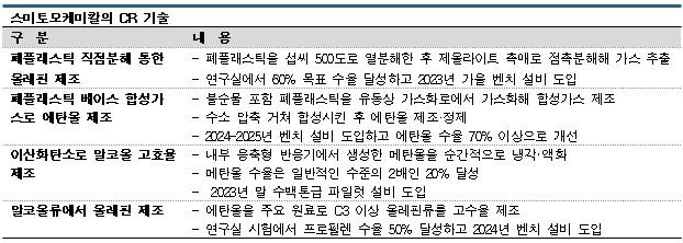 스미토모케미칼은 치바현(Chiba) 소데가우라(Sodegaura) 소재 에센셜 케미칼 연구소에서 미니 벤치 설비를 통해 올레핀 수율 목표 60%를 달성했으며 2023년 가을부터 2024년 초 사이에 수십킬로그램 수준으로 벤치 시험을 진행할 예정이다.