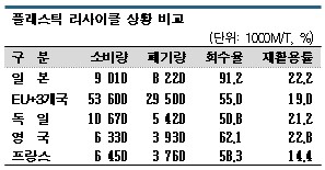 일본은 유럽과 거의 비슷한 수준으로 플래스틱 리사이클을 달성한 것으로 파악된다.