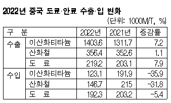 수입량도 다운스트림 수요 감소에 따라 이산화티타늄, 산화철 모두 30% 감소했다.