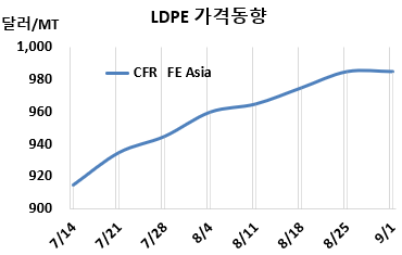 LDPE(Low-Density Polyethylene)는 보합세를 형성했다. LDPE 시세는 8월30일 CFR FE Asia가 톤당 985달러, CFR SE Asia는 1015달러로 변동이 없었다. CFR India는 1025달러로 10달러 상승했다. 표, 그래프: <LDPE 가격동향> <화학저널 2023/09/04> |
