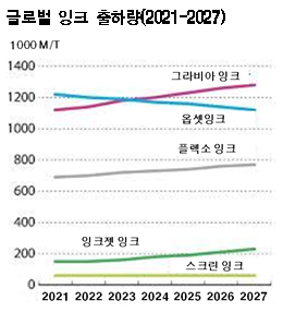 옵셋잉크는 2027년 6.7% 감소하는 반면, 그라비아 잉크는 128만톤으로 12.2% 증가할 전망이다.