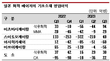 석유화학 사업이 주력인 미츠비시케미칼(Mitsubishi Chemical), 스미토모케미칼(Sumitomo Chemical), 아사히카세이(Asahi Kasei)는 3분기 연