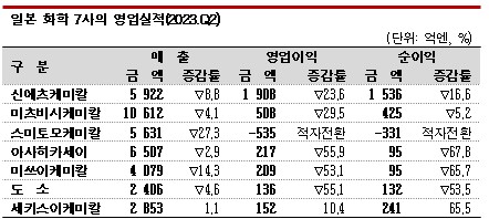 일본은 주요 화학기업 7사 중 세키스이케미칼(Sekisui Chemical)을 제외한 6사가 범용 석유화학제품 시황 악화로 2023년 2분기 영업이익이 전년동기대비 감소한 것으로 나타났다.