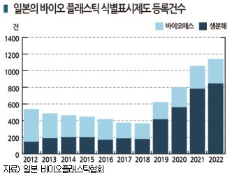 일본 바이오플래스틱협회는 바이오 플래스틱 식별표시 제도를 운영하고 있으며 2022년 4월부터 2023년 2월 사이 등록건수가 생분해성 플래스틱은 296건으로 전년동기대비 20건, 바이오매스 플래스틱은 854건으로 61건 증가한 것으로 알려졌다.