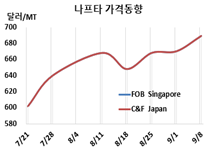 표, 그래프: <나프타 가격동향> <화학저널 2023/09/15> |