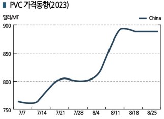 PVC 시세는 8월9일 CFR China 톤당 890달러, CFR SE Asia 895달러로 각각 80달러 폭등했고 CFR India도 905달러로 30달러 급등했다. 다만, 유럽은 8월11일 FD NWE 톤당 880유로로 10유로 하락했다.