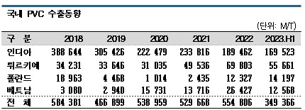 인디아는 세계 최대 PVC 수입국으로 2022년 수입량이 188만8400톤으로 전년대비 9.0% 증가했고 2023년 1-5월 155만2700톤으로 전년동기대비 84.2% 폭증했을 뿐만 아니라 6월 약 21만톤을 수입하며 PVC 수출가격 인상에 큰 영향을 미쳤다.