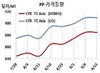 PP(Polypropylene)는 보합세를 형성했다. 아시아 PP 시세는 9월13일 CFR FE Asia 기준 라피아(Raffia) 및 인젝션(Injection) 그레이드가 톤당 885달러, IPP Film 및 BOPP는 895달러, 블록 코폴리머(Block Copolymer)는 910달러로 변동이 없었다. CFR SE Asia는 라피아 및 인젝션 955달러, IPP Film 및 BOPP 965달러, 블록 코폴리머 980달러로 변동이 없었고, CFR S Asia도 라피아·인젝션 1010달러, BOPP 및 IPP Film 1030달러, 블록 코폴리머 1055달러로 보합세를 형성했다. 표, 그래프: <PP 가격동향> <화학저널 2023/09/19> |