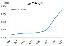 SM(Styrene Monomer)은 2주 연속 급등했다. SM 시세는 9월15일 FOB Korea가 톤당 1180달러로 55달러, CFR SE Asia는 1195달러로 60달러 급등했다. CFR China도 1165달러로 60달러, CFR India는 1235달러로 55달러 급등했다. 표, 그래프: <SM 가격동향> <화학저널 2023/09/20> |
