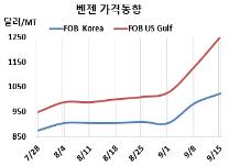 벤젠(Benzene)은 급등했다. 벤젠 시세는 9월15일 FOB Korea가 톤당 1025달러로 40달러, CFR SE Asia는 1020달러로 35달러 상승했다. 중화권도 CFR China가 1035달러로 35달러 올랐다. FOB Korea는 4월14일 1015달러를 형성한 이후 처음으로 1000달러를 돌파했다. 표, 그래프: <벤젠 가격동향> <화학저널 2023/09/20> |