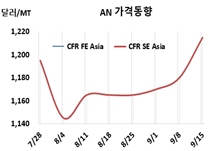 AN 시세는 9월15일 CFR NE Asia가 톤당 1215달러로 35달러, CFR SE Asia도 1215달러로 35달러 상승했다. CFR S Asia는 1140달러로 55달러 급등했다.
