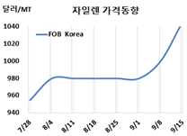 M-X(Mixed-Xylene)는 급등했다. 용제(Solvent) 그레이드 M-X 시세는 9월15일 FOB Korea가 톤당 1045달러로 45달러, CFR SE Asia는 1105달러로 50달러 급등했다. CFR China는 1045달러로 35달러, CFR India는 1145달러로 45달러 올랐다. 표, 그래프: <자일렌 가격동향> <화학저널 2023/09/21> |