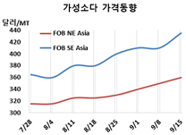 가성소다(Caustic Soda)는 또 상승했다. 가성소다 시세는 9월15일 FOB NE Asia가 톤당 360달러로 10달러 상승했고 CFR SE Asia는 435달러로 25달러 올랐다. 표, 그래프: <가성소다 가격동향> <화학저널 2023/09/22> |