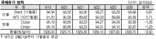 반면, 두바이유(Dubai)는 1.26달러 떨어져 92.83달러를 형성했다.