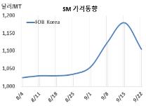 SM(Styrene Monomer)은 폭락이 불가피했다. SM 시세는 9월22일 FOB Korea가 톤당 1105달러, CFR SE Asia는 1120달러로 각각 75달러 폭락했다. CFR China도 1090달러로 75달러, CFR India는 1155달러로 80달러 폭락했다. 표, 그래프: <SM 가격동향> <화학저널 2023/09/27> |