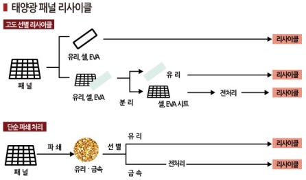 또 패널을 구성하는 유리, 셀, 배선을 하나씩 분해하는 고도 선별 리사이클은 부품끼리 접착할 때 사용한 EVA(Ethylene Vinyl Acetate)를 효율적으로 제거하는 것이 어렵다는 한계가 있다.