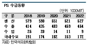 국내 PS 생산량은 2018년 57만9000톤에서 2019년 59만톤, 2020년 65만1000톤으로 크게 증가했으나 2021년 62만1000톤으로 급감하고 2022년에는 62만7000톤으로 증가하는 등 수요에 따라 크게 움직이고 있다.