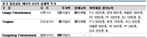 Hengyi Petrochemical, Tongkun, Rongsheng Petrochemical 등 합성섬유 메이저 3사는 P-X(Para-Xylene) 등 원료부터 폴리에스터(Polyester) 섬유까지 일관 생산하고 있으나 최근 국제유가 변동 폭이 확대됨에 따라 중국시장에서 도태 및 집약이 가속화될 것으로 예상하고 동남아 투자로 눈을 돌리고 있다. 각각 9조원 이상의 초대형 석유정제·석유화학 일체화 단지 건설 프로젝트를 추진하고 있다.