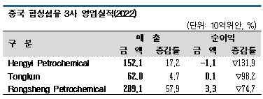 Tongkun은 매출이 62억위안으로 4.7% 증가했으나 순이익은 1억위안으로 98.2% 격감했고, Rongsheng Petrochemical 역시 매출은 2891억위안으로 57.9% 급증했음에도 순이익은 3억3000만위안으로 74.7% 격감했다.