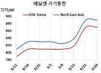 에틸렌 시세는 9월29일 CFR NE Asia가 톤당 890달러로 변동이 없었으나, CFR SE Asia는 900달러로 30달러 상승했다. FOB Korea는 870달러로 보합세를 형성했다.