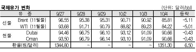 브렌트유, 85.81달러로 5.11달러 떨어져 … 두바이유 90.66달러로