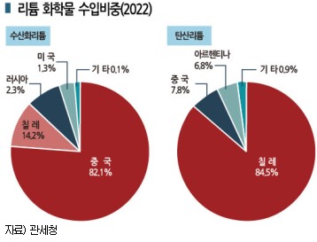 국내 배터리 생산기업들은 하이니켈 NCM(니켈·코발트·망간) 배터리 양극재 제조에 쓰이는 수산화리튬을 거의 전량 수입하며, 특히 중국산