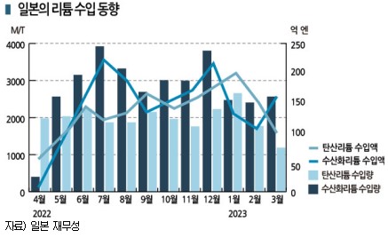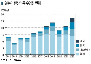 전체 리튬 수입량은 2021년 7년만에 감소로 전환됐으나 2022년에는 탄산리튬 수입량이 2만4600톤으로 2019년 대비 4.3% 증가해 코로나19(신종 코로나바이러스 감염증) 이전 수준을 회복했고 수입액은 426억7517만엔으로 319.5% 폭증한 것으로 나타났다.