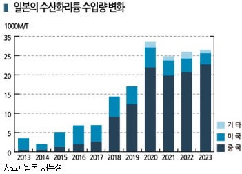 수산화리튬은 코로나19 이전인 2019년에도 수입량이 3만7300톤으로 2013년에 비해 1314.3%, 수입액은 529억3400만엔으로 2533.3% 폭증한 바 있다.