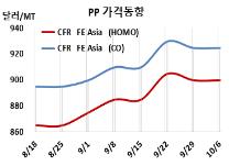 원료 프로필렌(Propylene)은 10월3일 CFR China 톤당 860달러, FOB Korea 820달러로 변동이 없었고, PP(라피아: CFR FE Asia)와 프로필렌(CFR China)의 스프레드는 톤당 40달러로 손익분기점 150달러를 크게 밑돌아 적자가 확대되고 있는 것으로 분석된다.