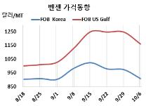 벤젠(Benzene)은 세계적으로 폭락세가 나타났다. 벤젠 시세는 10월6일 FOB Korea가 톤당 910달러로 65달러 폭락했고 CFR SE Asia는 925달러로 45달러 급락했다. CFR China도 940달러로 45달러 급락했고 CFR Taiwan은 930달러로 65달러 폭락했다. 표, 그래프: <벤젠 가격동향> <화학저널 2023/10/11> |