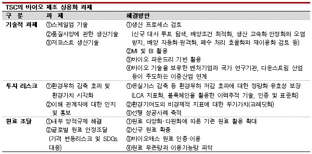 기술개발 과제로는 저코스트 생산기술, 스케일업 기술, 화석 베이스 사양과 동등한 품질에 관한 생산기술 향상을, 해결방안으로는 생산 프로세스를 검토하면서 일본이 보유한 강점을 활용할 수 있는 목표 화합물을 선정하고 화합물의 모델 실증 개발을 통해 제조공법을 확립해 횡적으로 적용하는 방법을 제시했다.