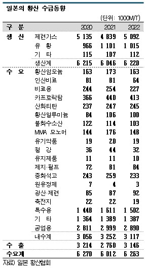 일본 황산협회에 따르면, 2022회계연도(2022년 4월-2023년 3월) 황산 내수는 311만7000톤으로 4.2% 감소했으며 수출은 314만톤 수준으로 집계됐다.