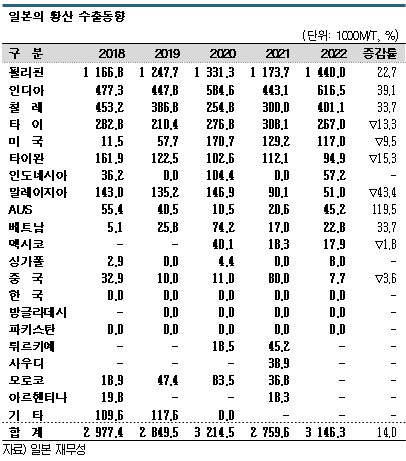 일본은 2022회계연도 필리핀에 대한 황산 수출량이 144만톤으로 22.7% 증가했다. 필리핀은 일본기업들과 함께 대형 니켈 제련 프로젝트를 추진하고 있어 침출용 수요가 큰 것으로 파악된다.