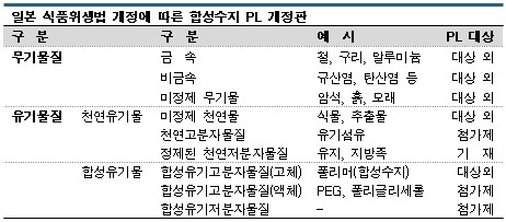 일본은 2018년 식품위생법 개정을 통해 식기 등 기구와 PET(Polyethylene Terephthalate) 병을 포함한 용기포장에 사용되는 합성수지에 대한 포지티브 리스트 제도 도입을 결정한 바 있다.