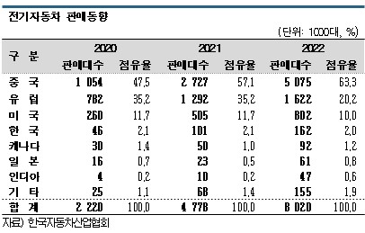 특히, 중국은 전동자동차 판매대수가 507만대로 글로벌 시장의 63.3%를 차지했다. 2022년까지 연장된 전기자동차 보조금 혜택과 보급형‧고급 등 차종 다양화에 따른 것으로 파악된다.